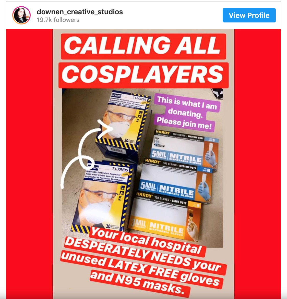 Cosplayers in Washington are sewing masks and donating supplies to local hospitals. https://www.kuow.org/stories/morea-face-masks-coming-to-medical-facilities-from-washington-cosplayers
